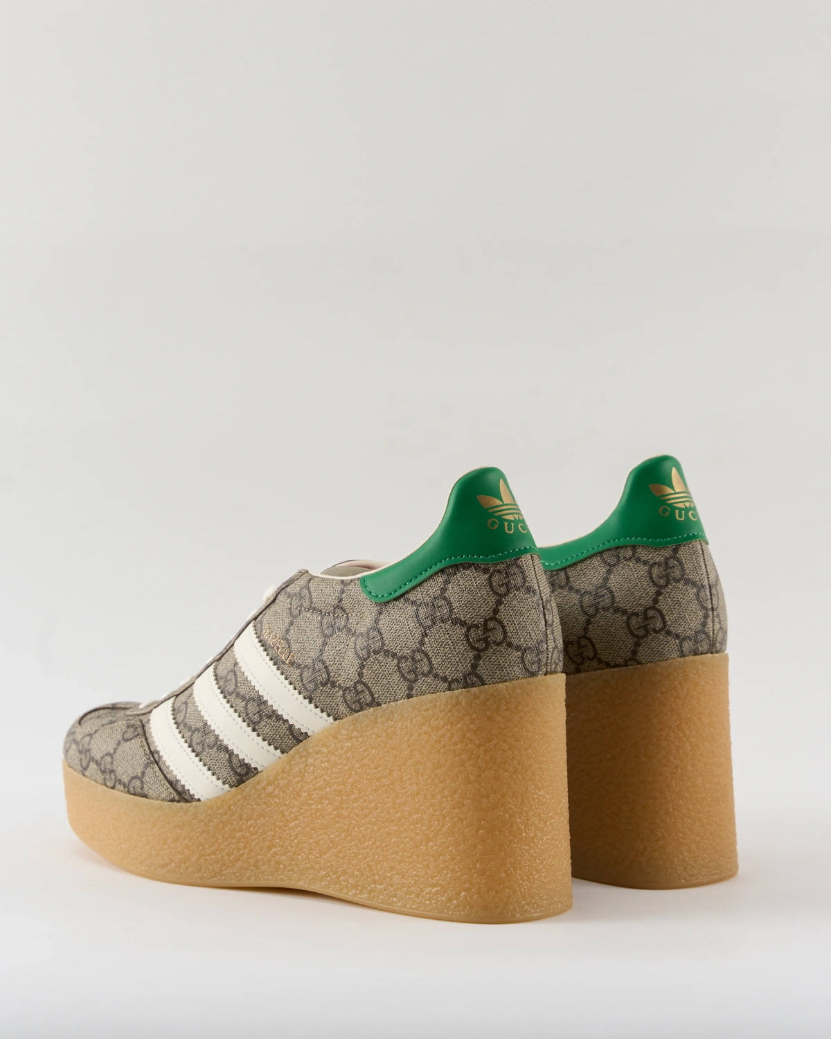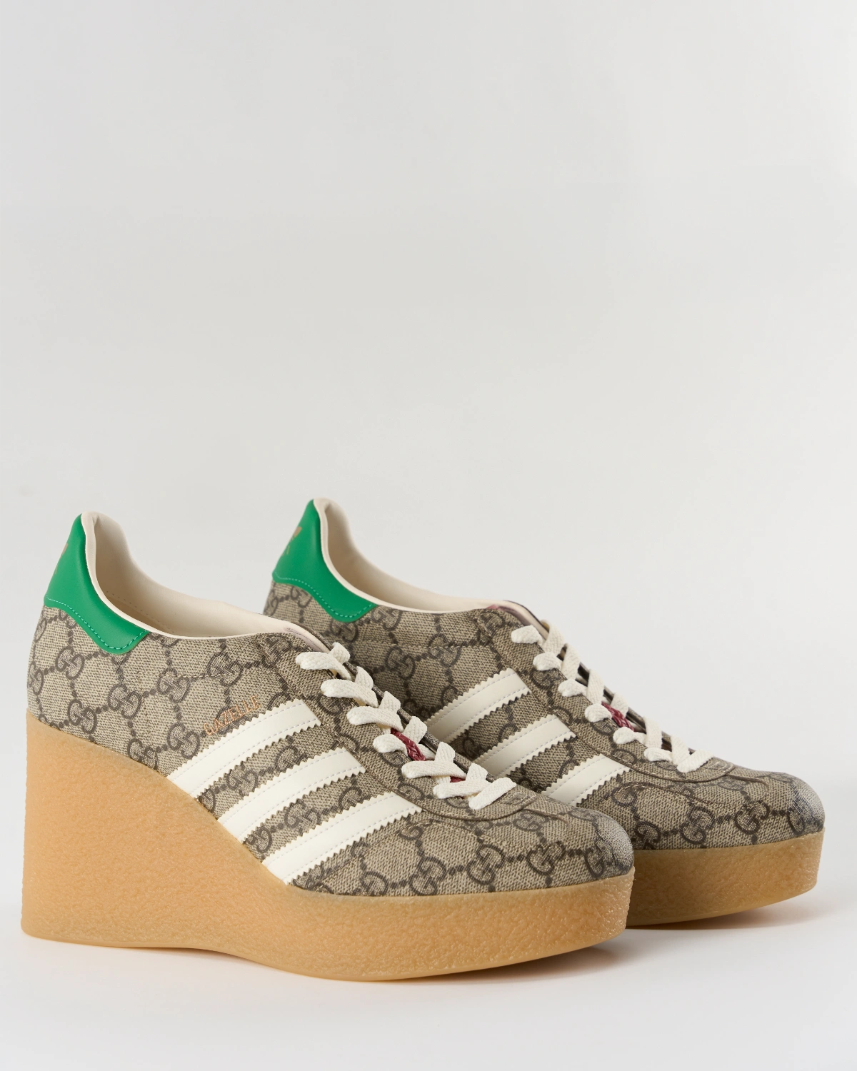 A masterful blend of sport heritage and high-fashion luxury, the adidas x Gucci Gazelle Wedge ’GG Monogram’ elevates the classic sneaker silhouette with couture-level detailing. Wrapped in Gucci’s signature GG canvas and mounted on a subtly lifted wedge sole, it balances retro athletic soul with modern luxury flair – perfect for street-to-streetwear fusion with an unmistakable designer edge.