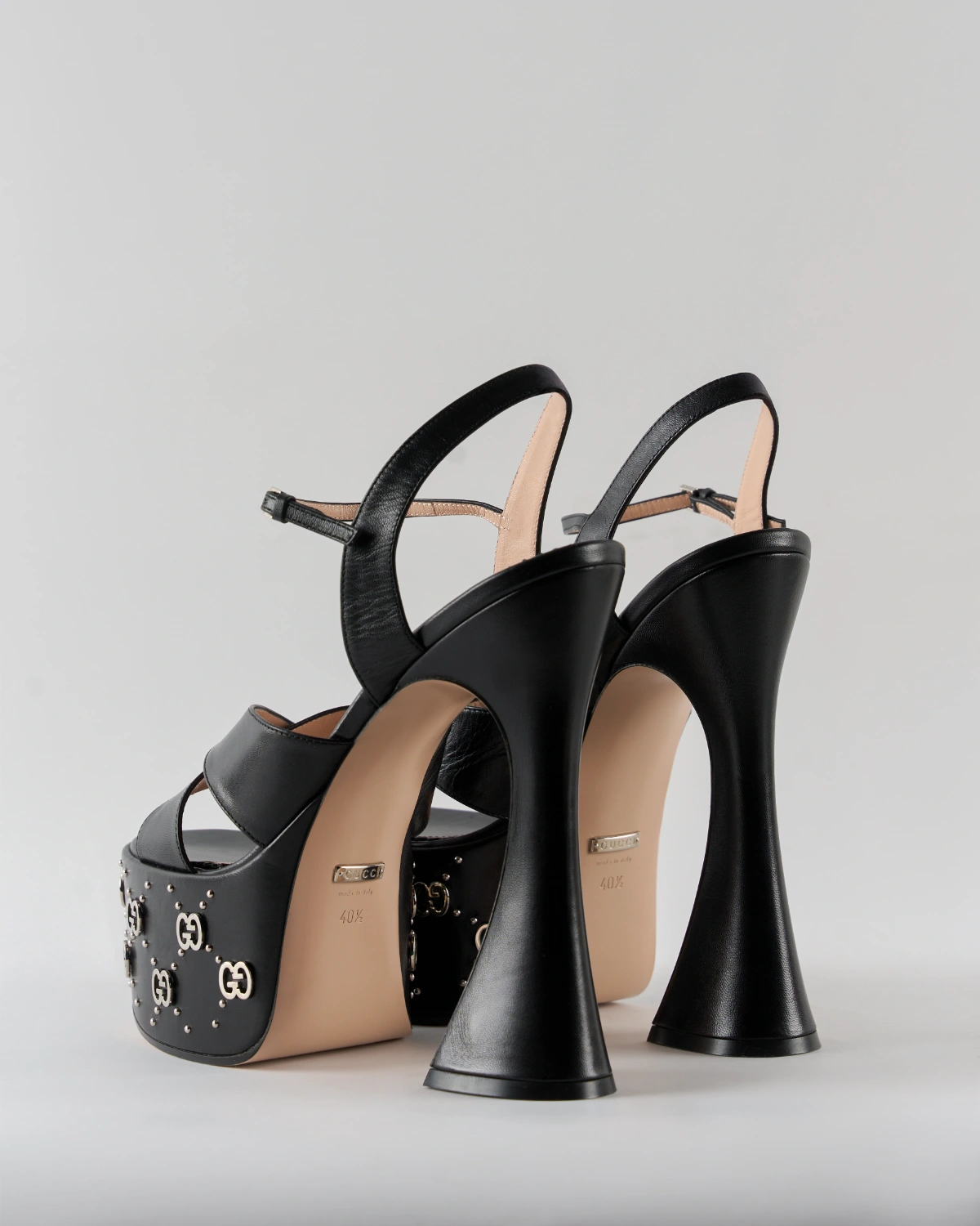 The Gucci Janaya Leather GG Stud Platform Sandals fuse bold glamour with modern luxury. Crafted in smooth leather, the sandals feature signature GG-stud detailing across the criss-cross vamp and an adjustable ankle strap, creating a sculptural and edgy silhouette. Elevated by a spool block heel and platform sole, they bring height and presence while maintaining comfort.