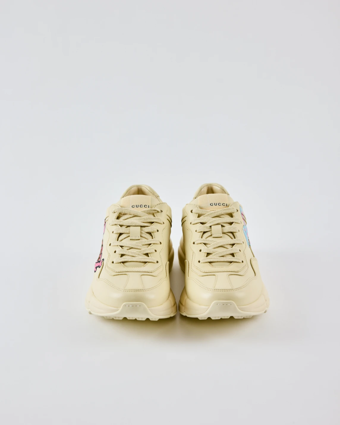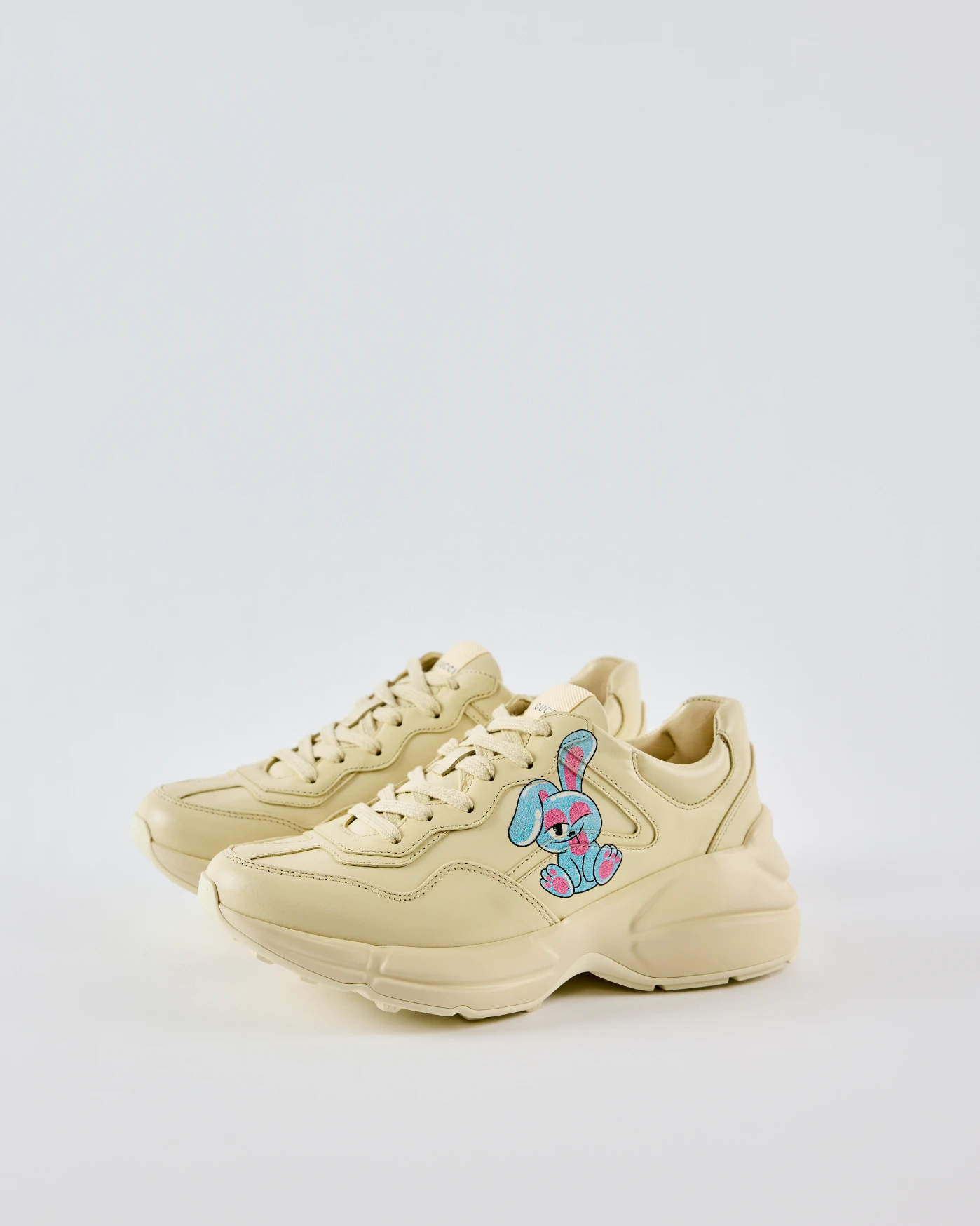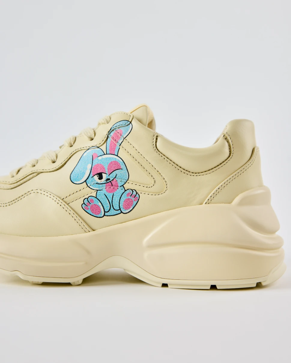 The Gucci Rhyton sneakers deliver a bold streetwear statement with a chunky silhouette and prominent script logo. Crafted in smooth leather, they merge retro athletic influence with modern luxury appeal. A confident essential for elevated casual styling.