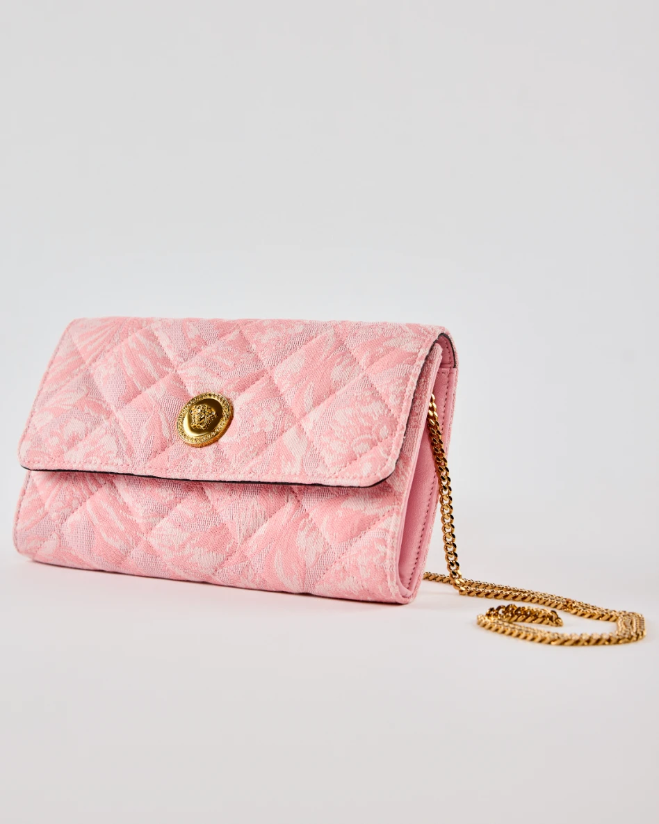 This Greca Goddess wallet brings Versace’s sculptural identity into a functional silhouette, crafted in soft pink with a delicate chain accent. The structured design complements the ornate hardware. Feminine and polished, it offers refined everyday luxury.